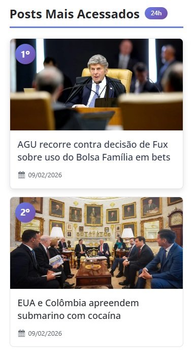 Destaque para os posts mais acessados: cada post aparece com posição, imagem, título e data de publicação, tornando a navegação mais atrativa.